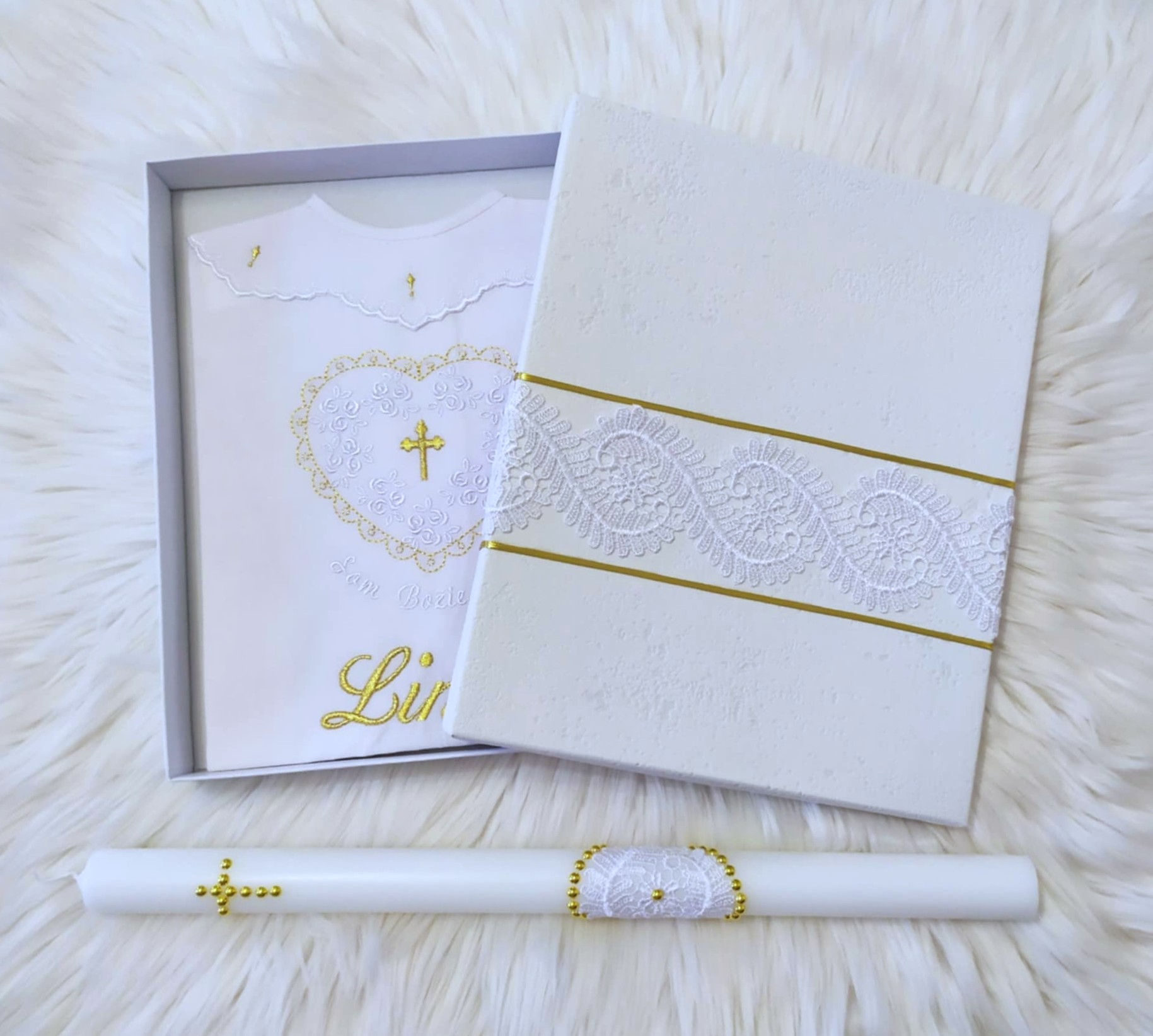košieľka + sviečka person.+ krabička na košieľku a sviečku biela ,zlatá + ruženec