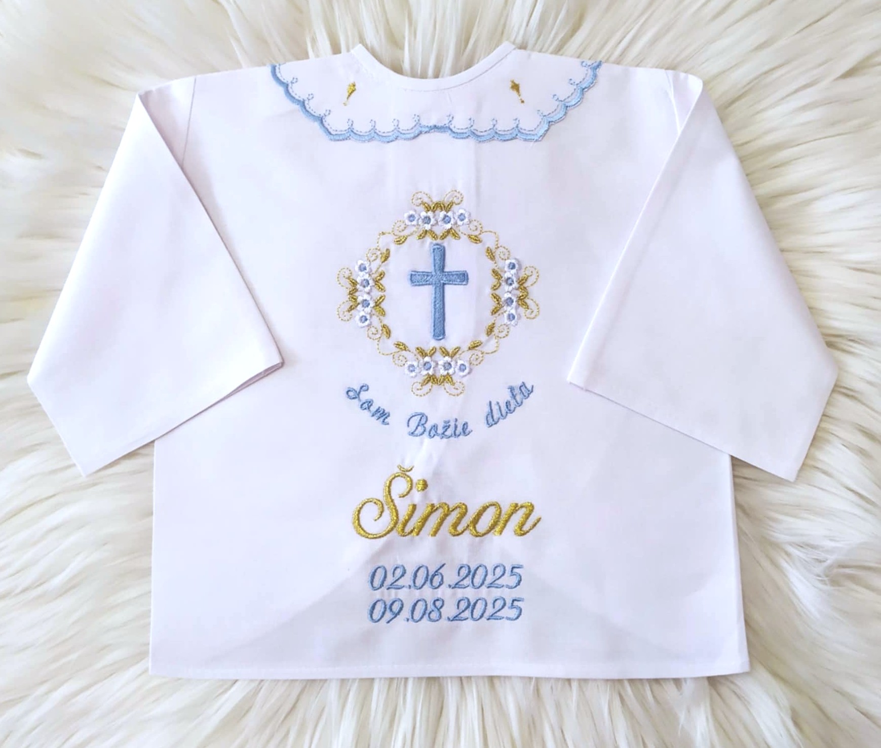 Košieľka na krst s menom – modrá, zlatá