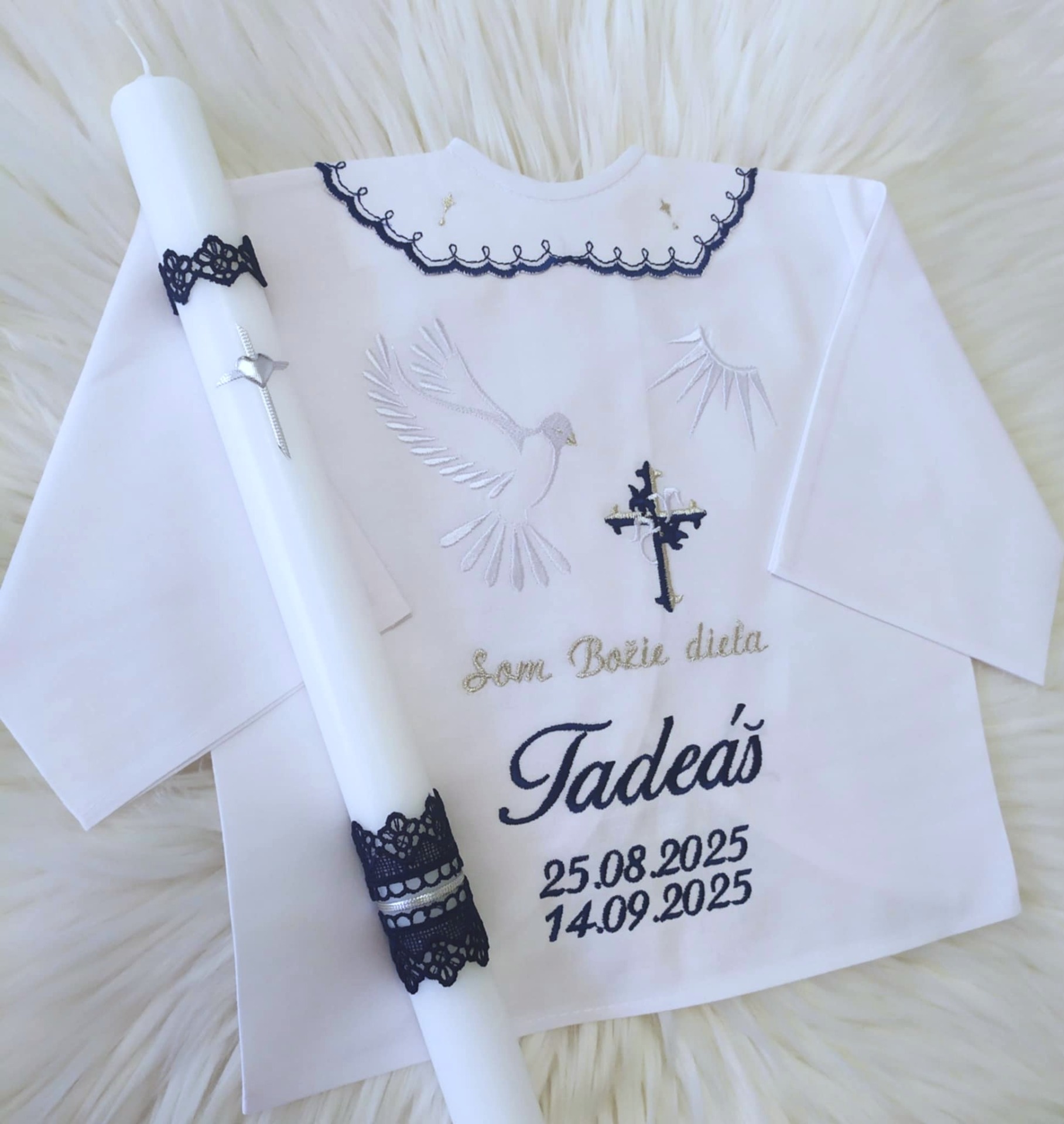 Vyšitie mena dieťaťa , dátumov a vety Som dieťa Božie sú v cene košieľky.