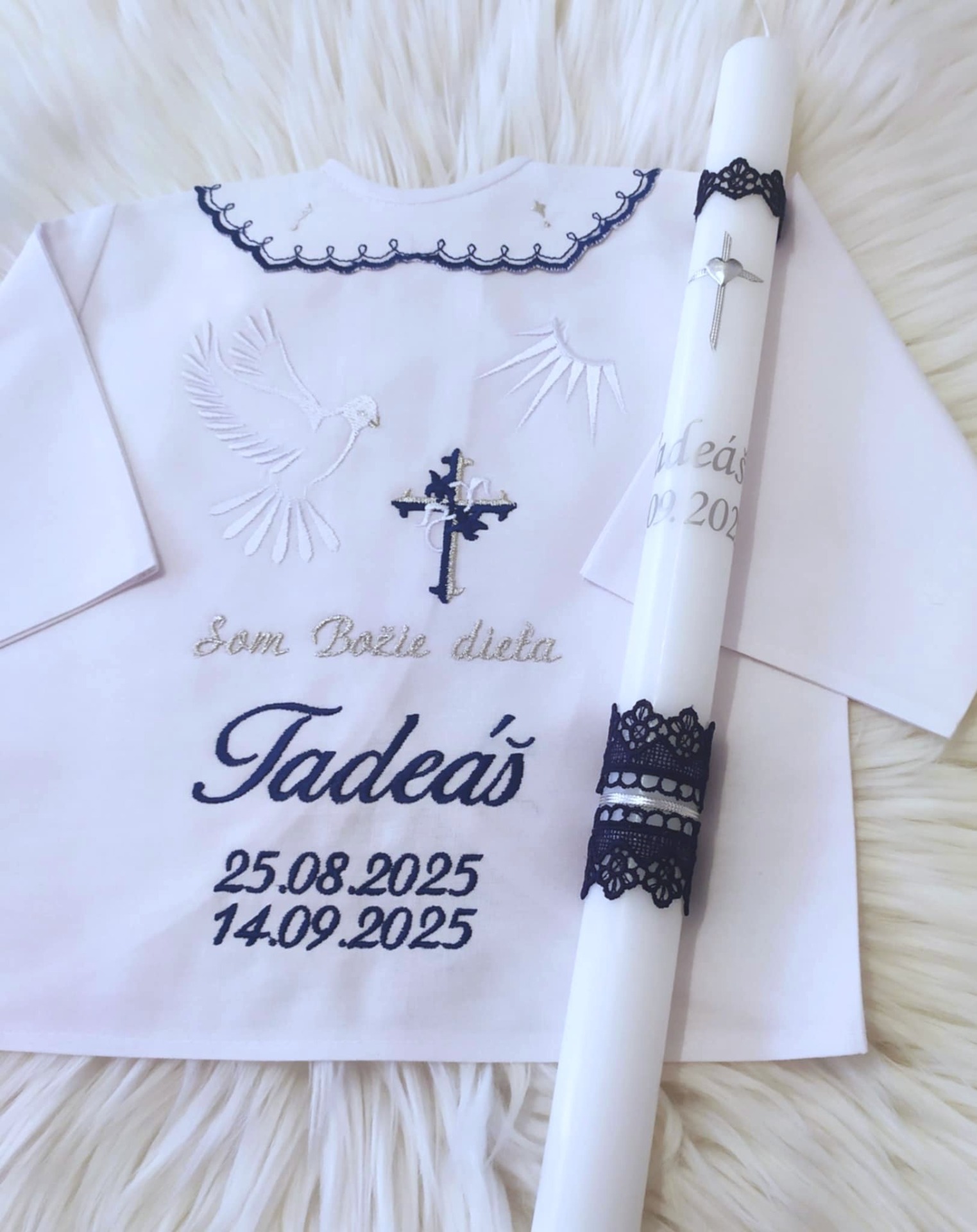 Vyšitie mena dieťaťa , dátumov a vety Som dieťa Božie sú v cene košieľky.