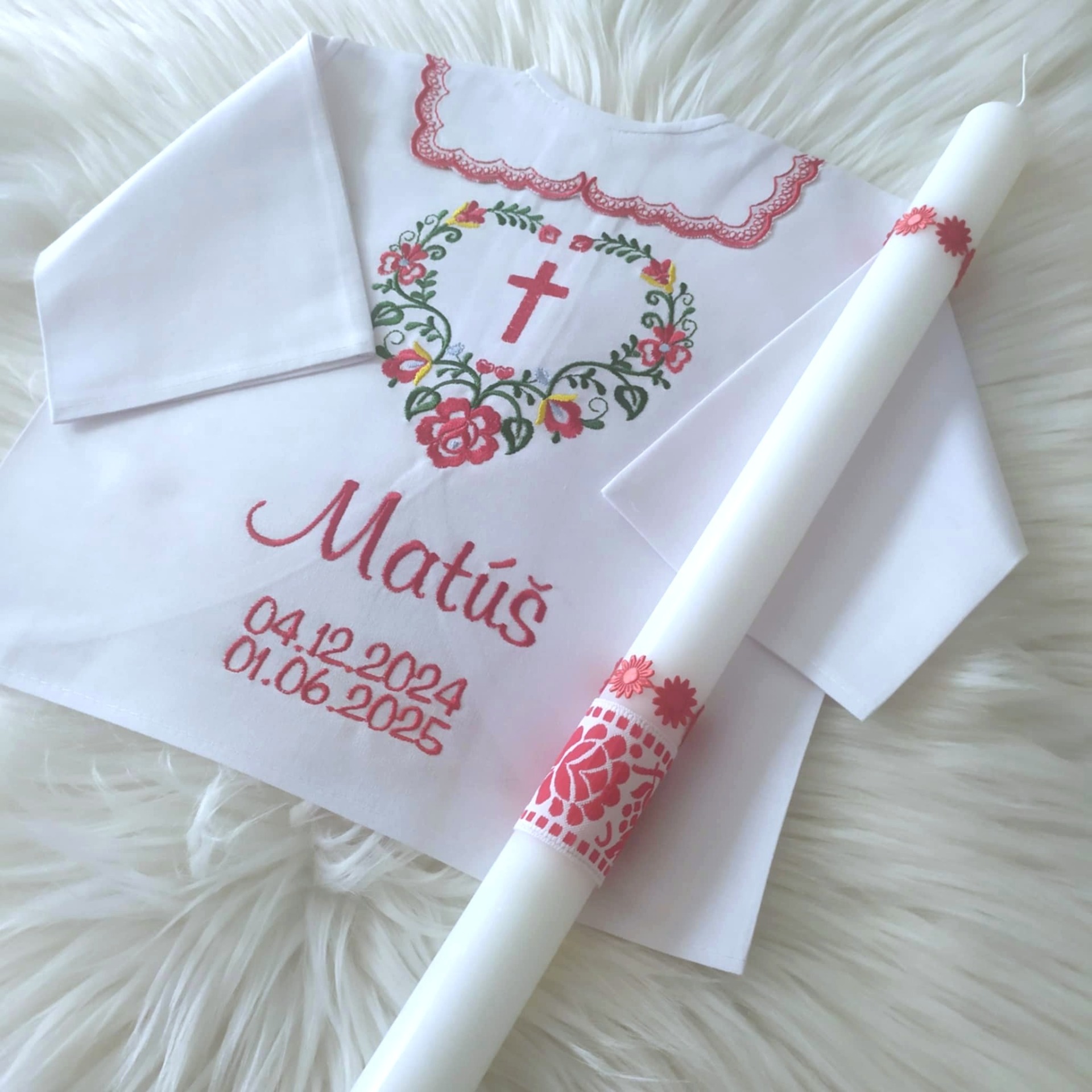 set na krst s menom –  košieľka folk, sviečka personalizovaná