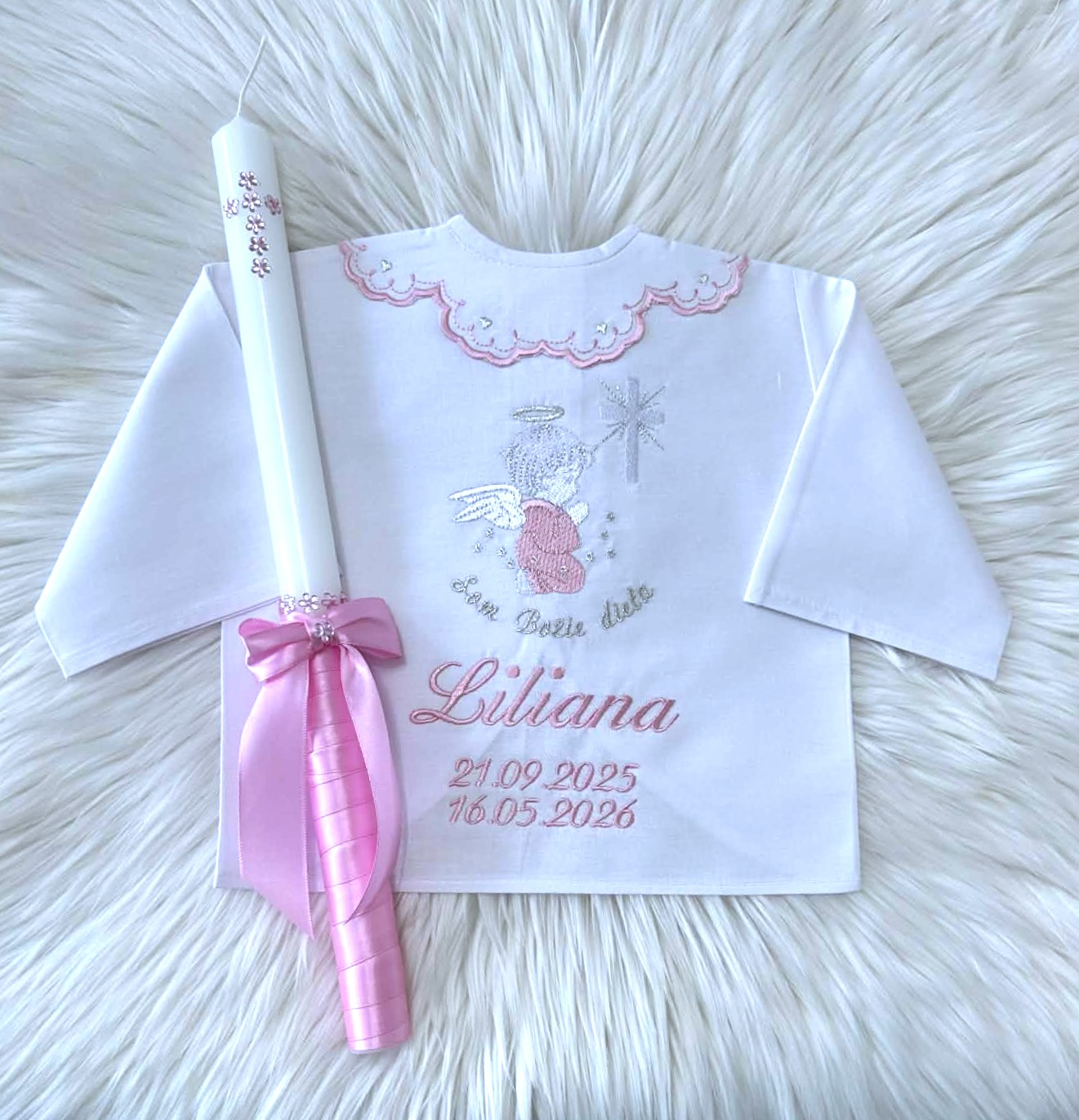 set na krst s menom – košieľka ružová , biela, zlatá, sviečka nepersonalizovaná