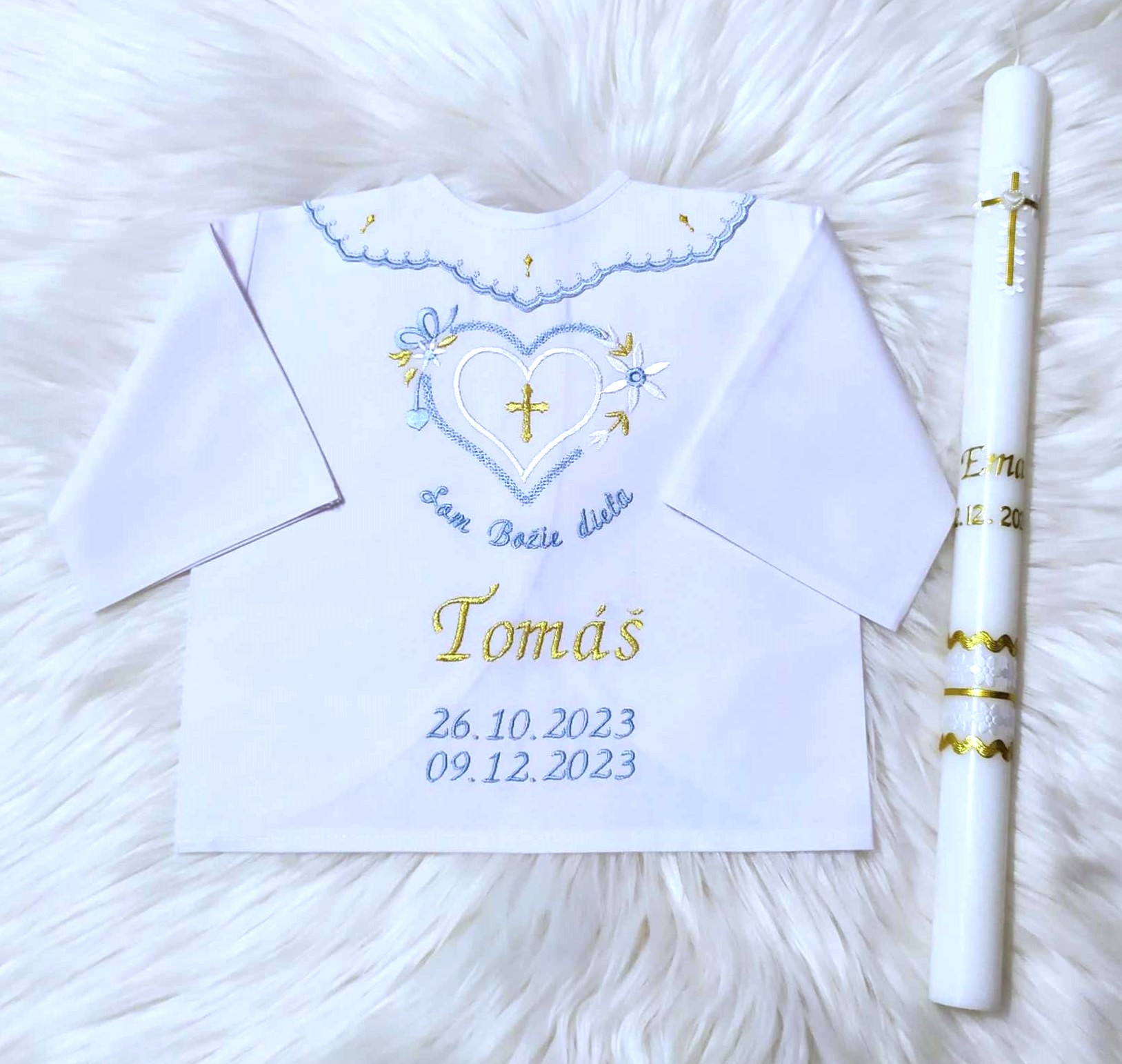 Krstná košieľka na mieru + sviečka - modré srdce
