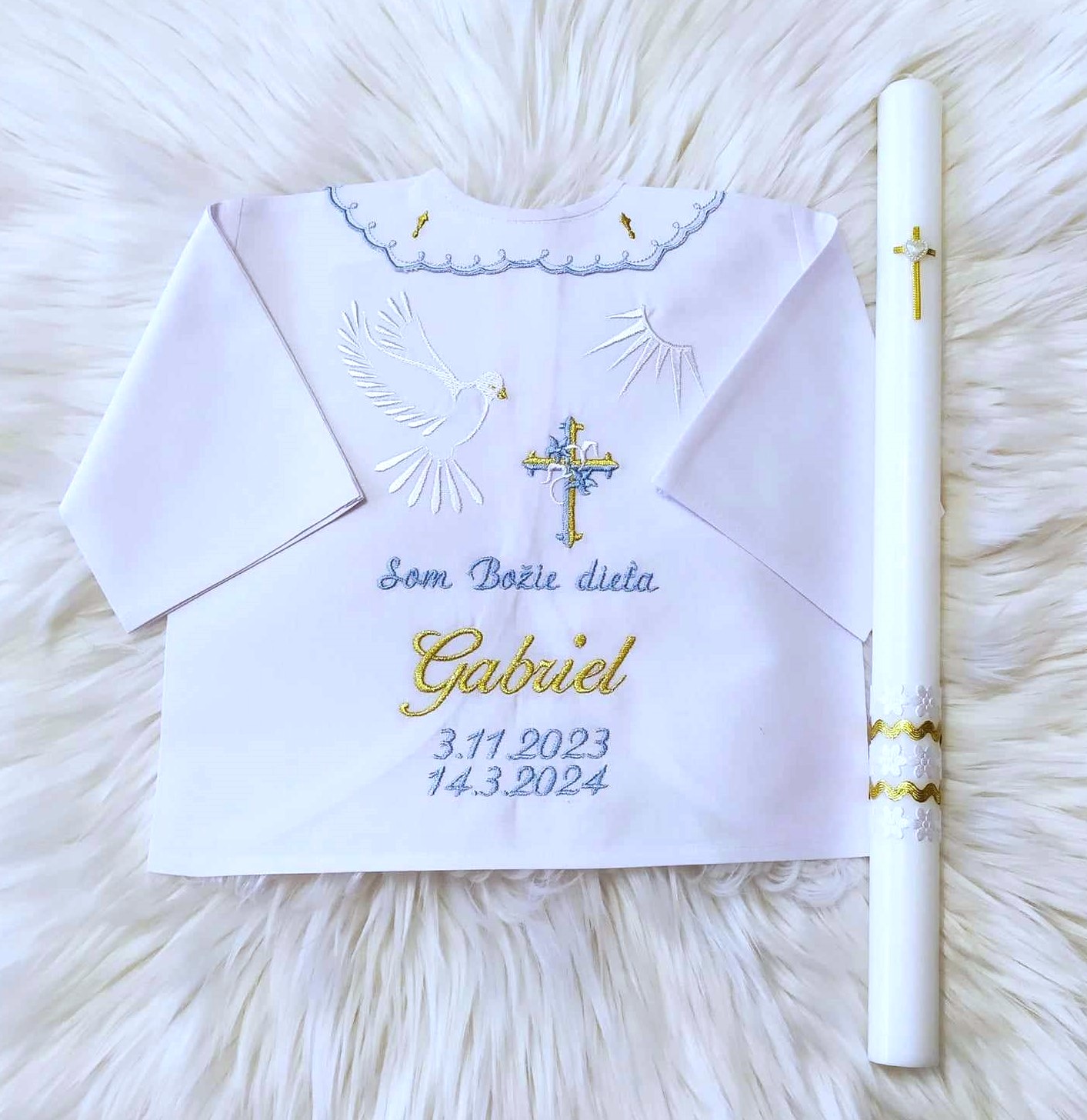 set na krst s menom – košieľka modrá, zlatá , sviečka personalizovaná