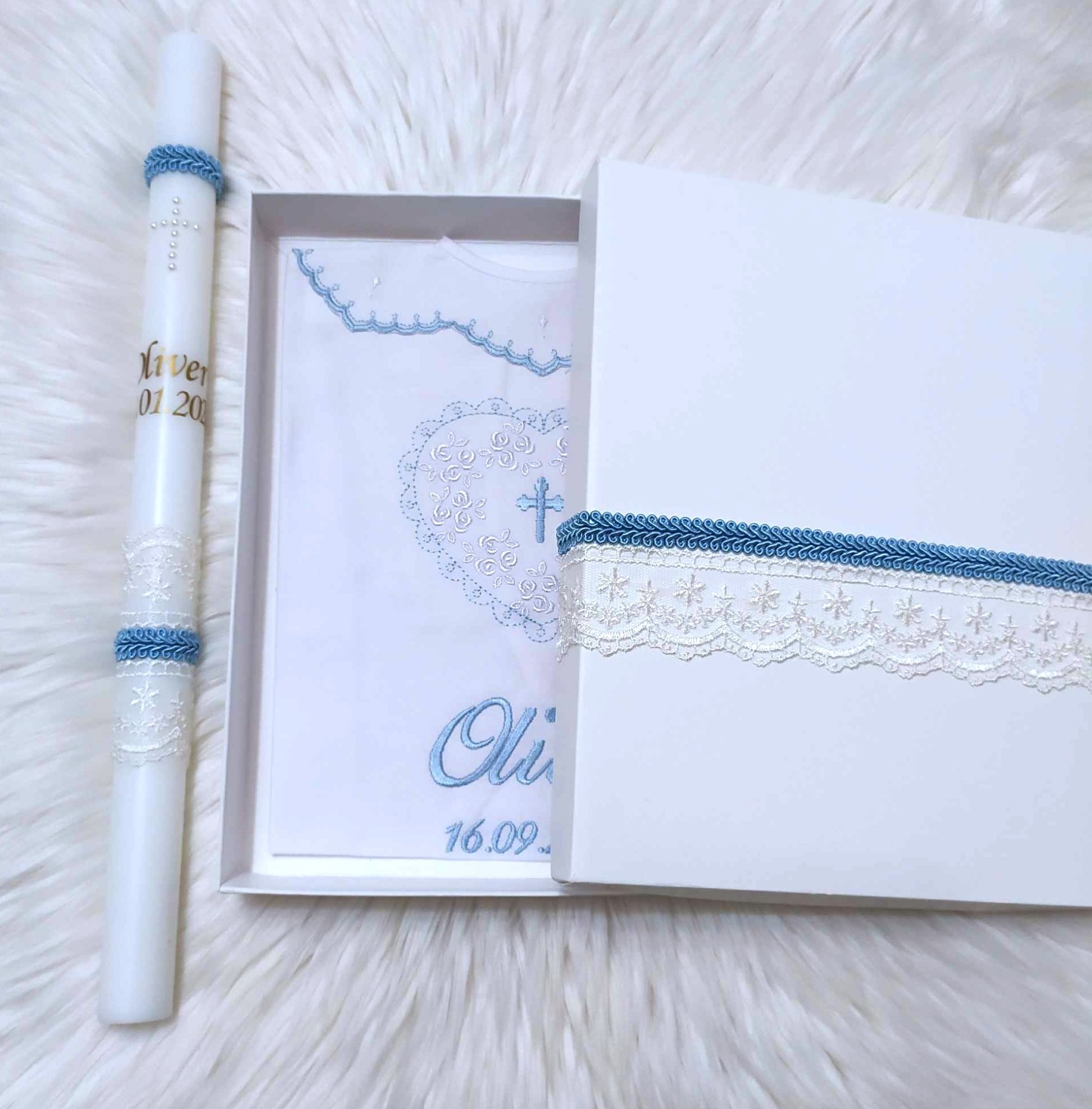 Personalizovaný dar na krst – košieľka, sviečka a krabička s výšivkou